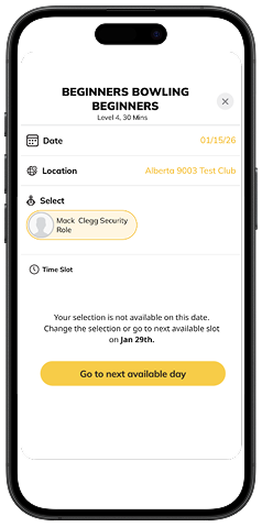 Next Available Appointment Booking introduces a shortcut that automatically surfaces the earliest valid appointment slot based on selected service and trainer. Members can confirm instantly or explore other options without manually searching across multiple days.