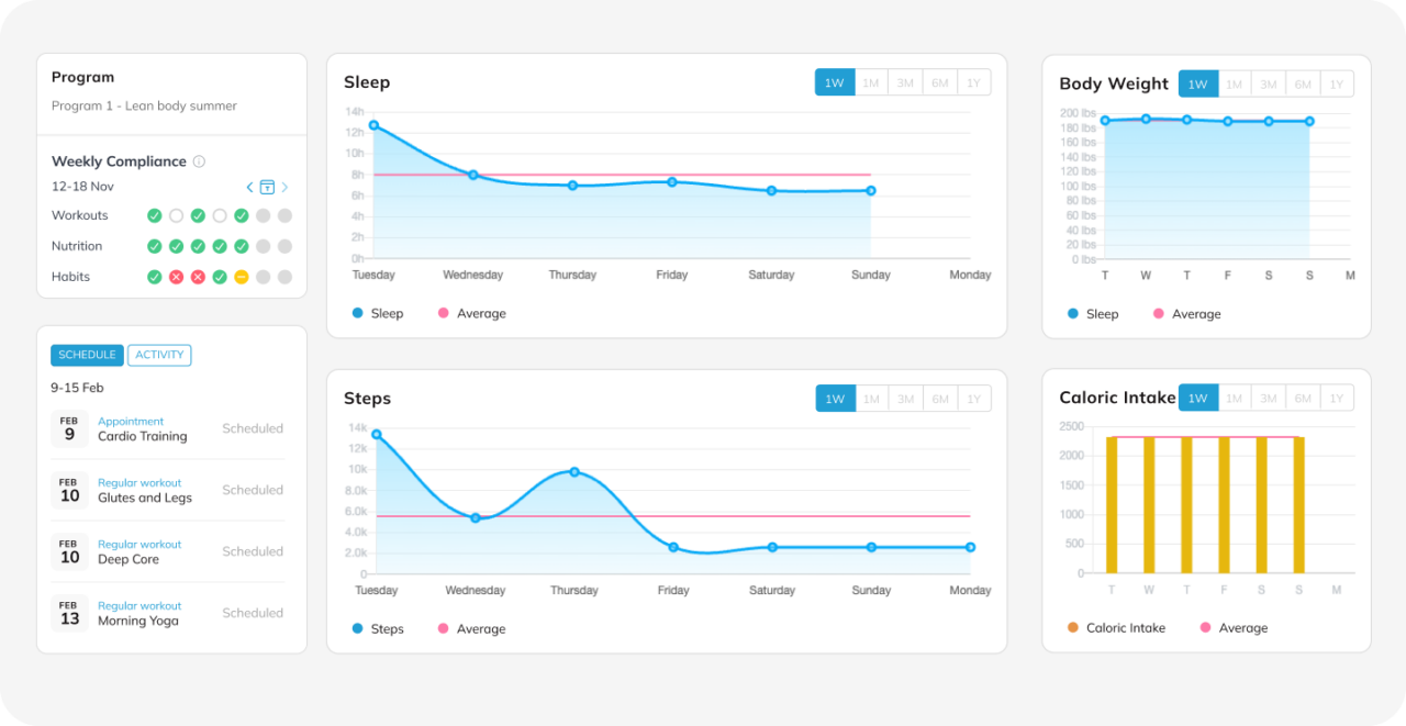 The Insights Dashboard provides a centralized, at-a-glance view of key client performance and engagement metrics. Trainers can quickly identify trends, monitor progress over time, and guide more informed coaching conversations.