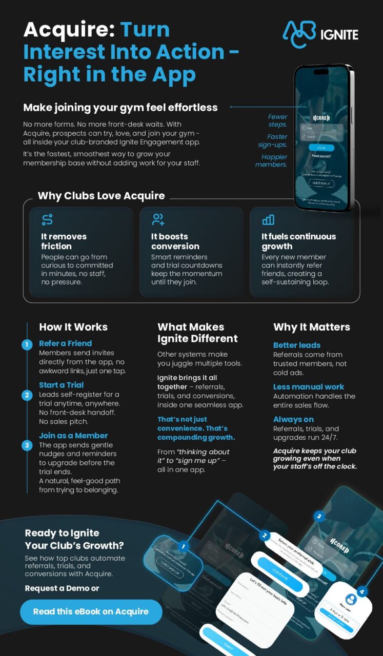 Acquire, a feature inside Ignite Engagement that helps fitness clubs grow automatically by turning referrals and trials into memberships. It’s one of the most valuable tools for clubs that want to grow faster without adding more to their team’s plate.